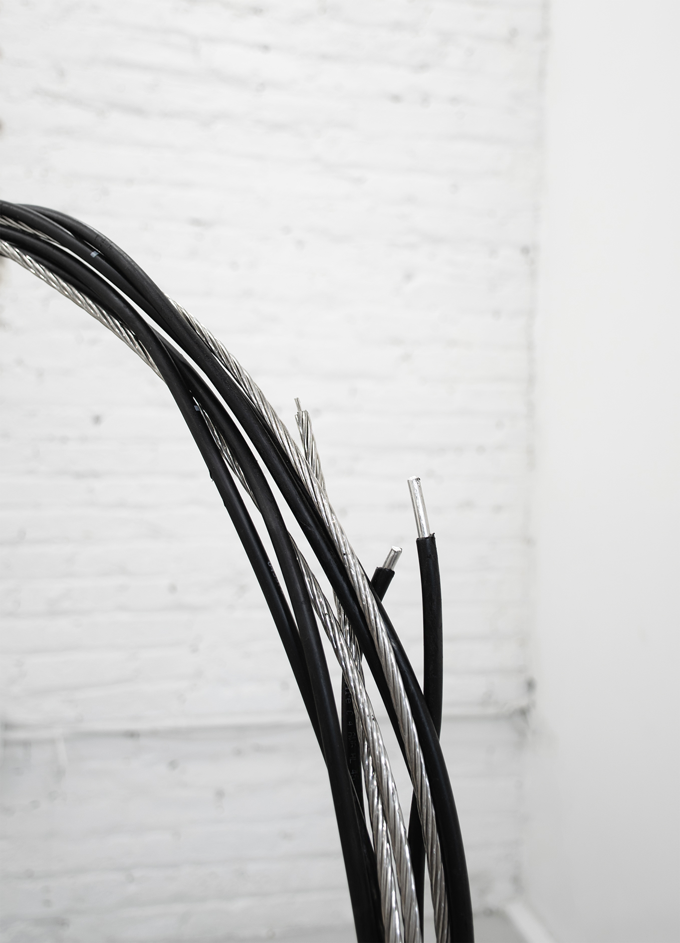 Pine Lasso, 2024 graphite-rubbed disregarded pine, found telephone wire, cedar, and hardware 48.5" x 15 " x 28 "