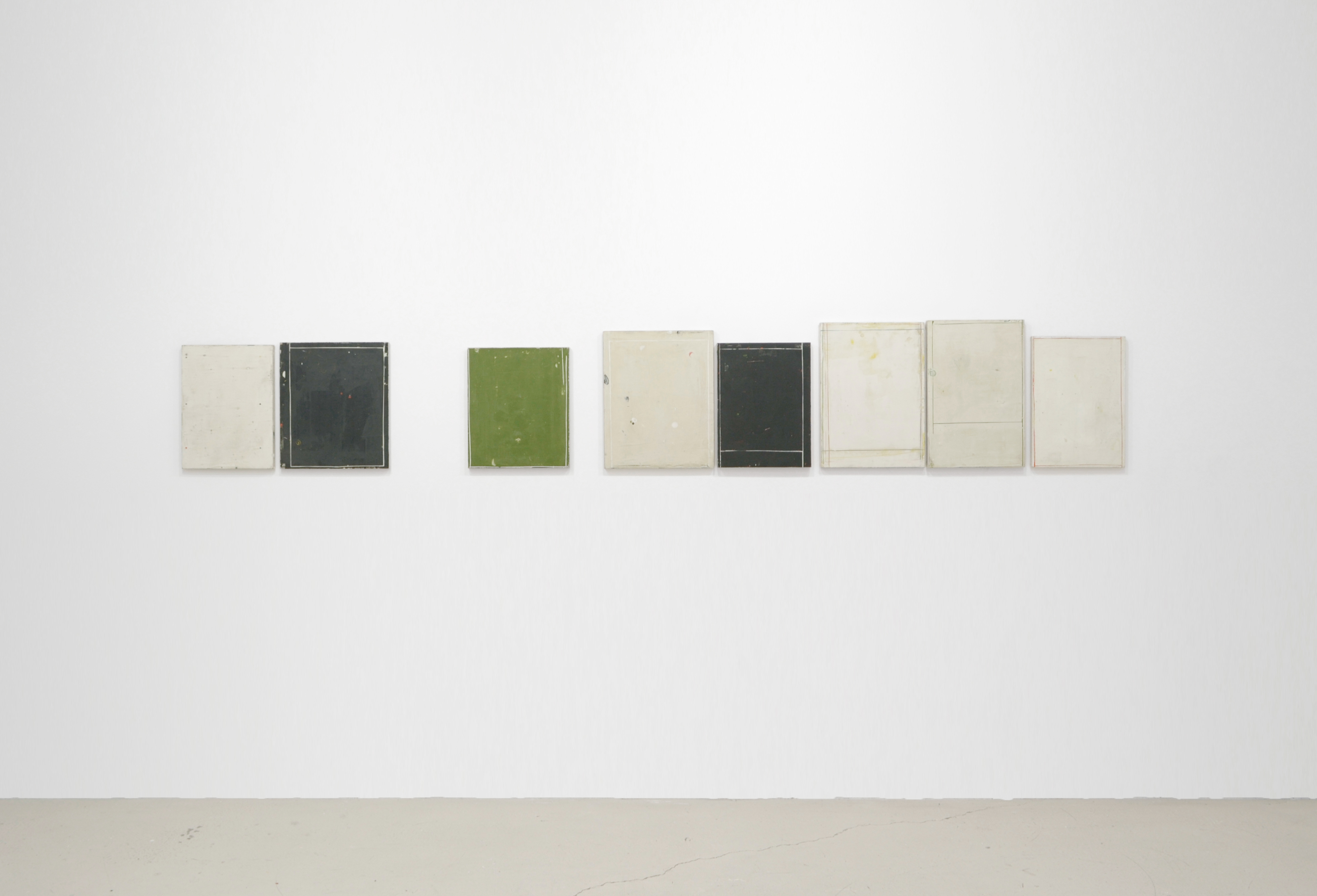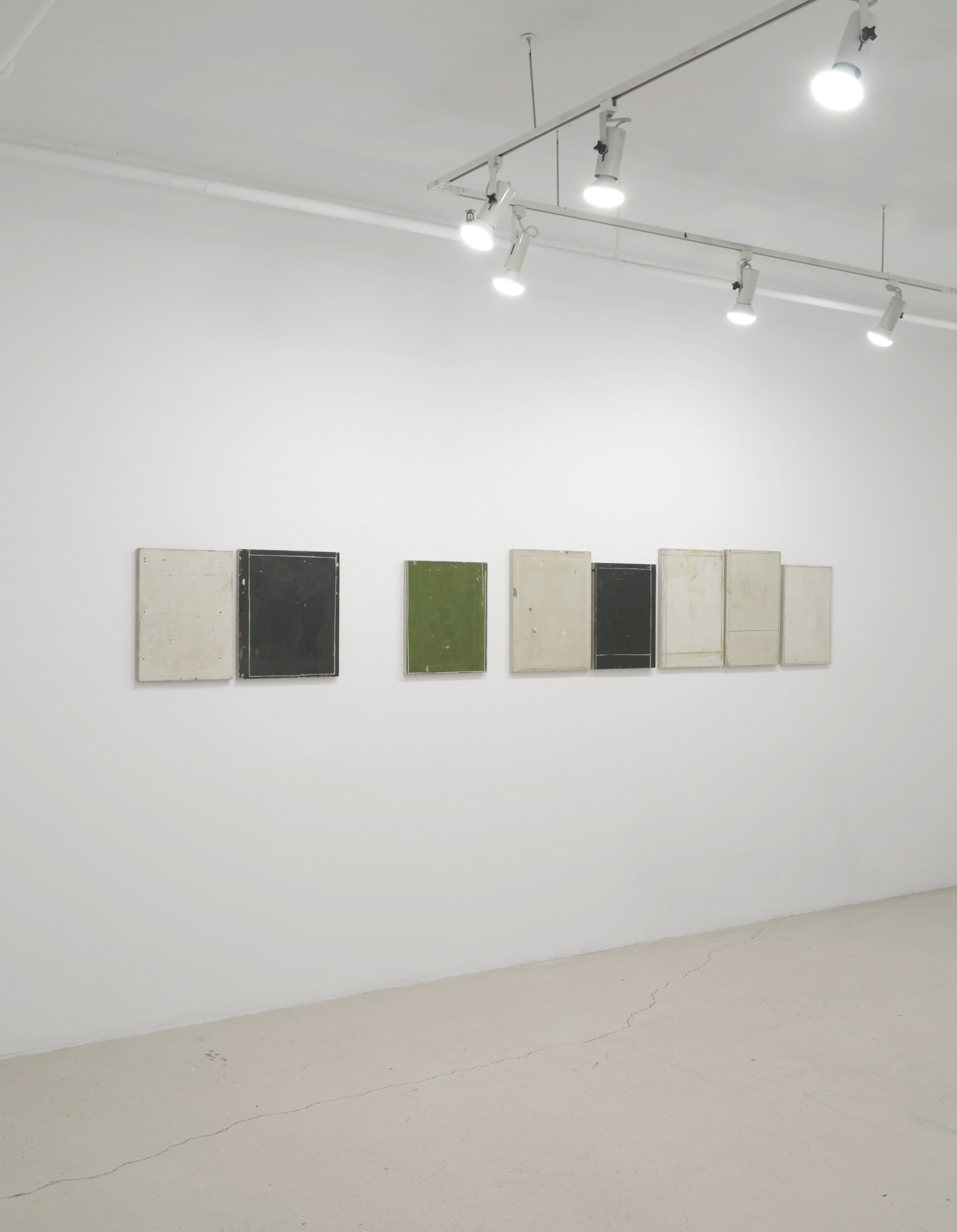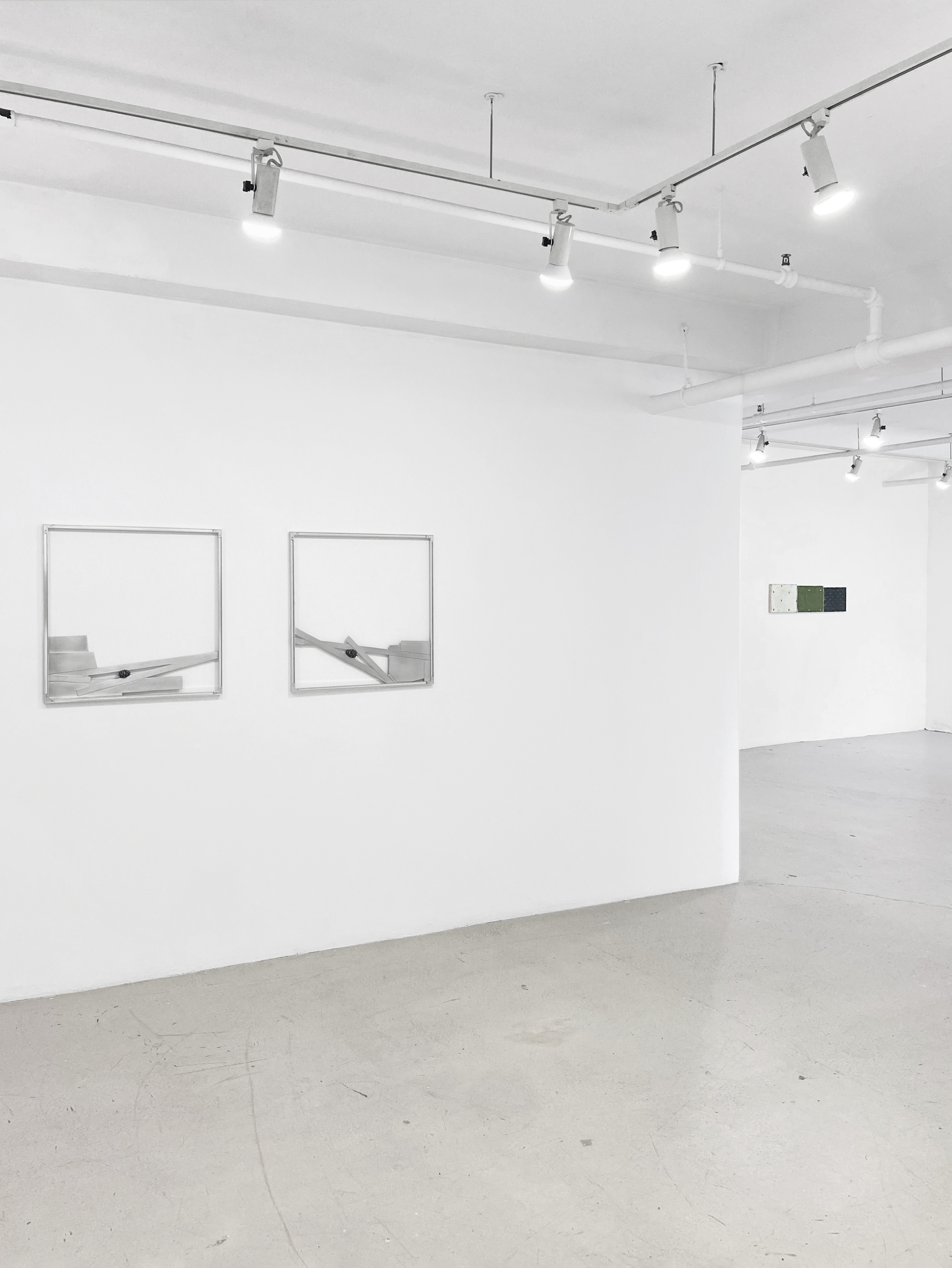 (schematic spectrum) 2016. graphite transfer of architectural drafting plan on paper, steel, magnets, (2) altered wooden frames, found Ryerson and Burnham Library pencil, and hardware