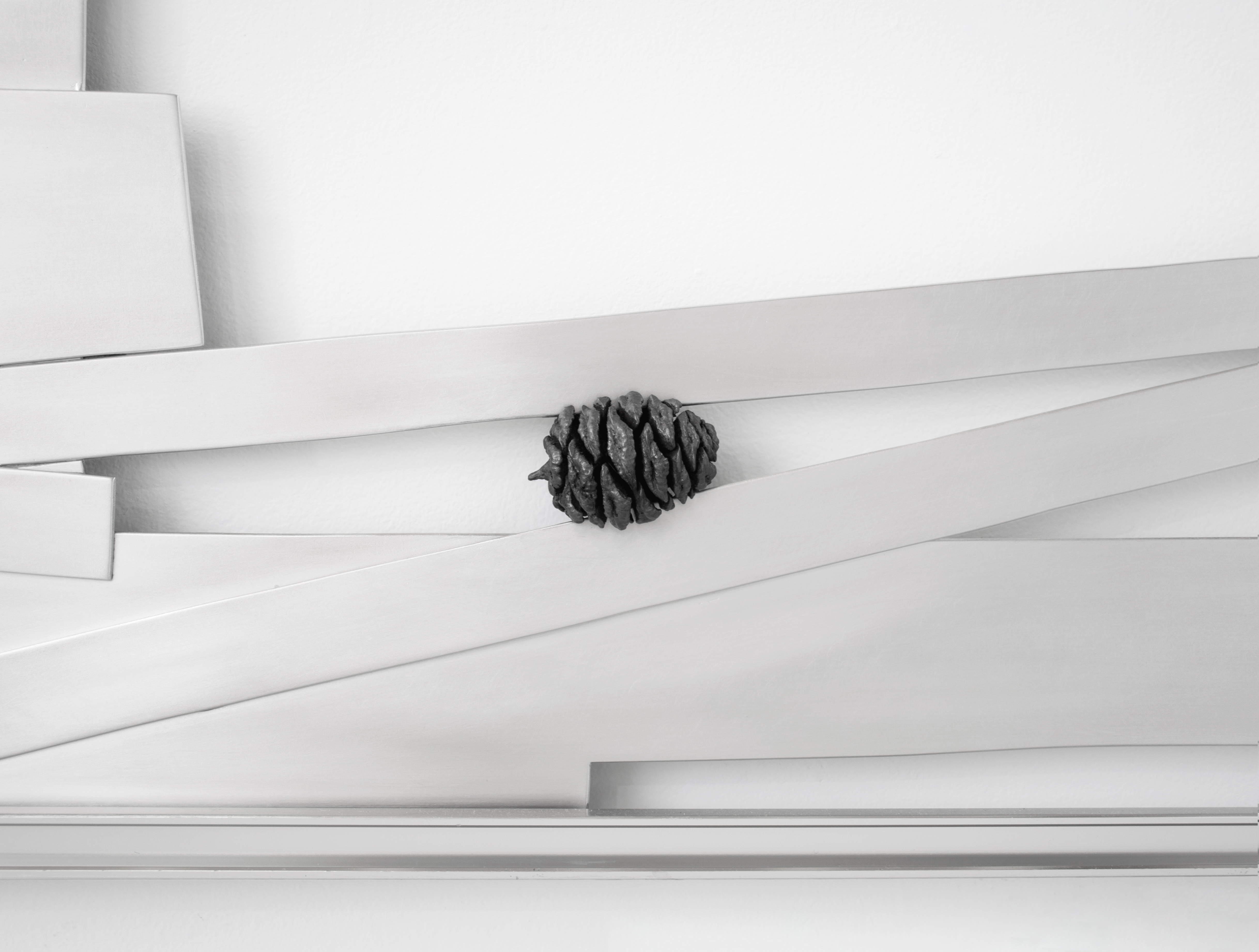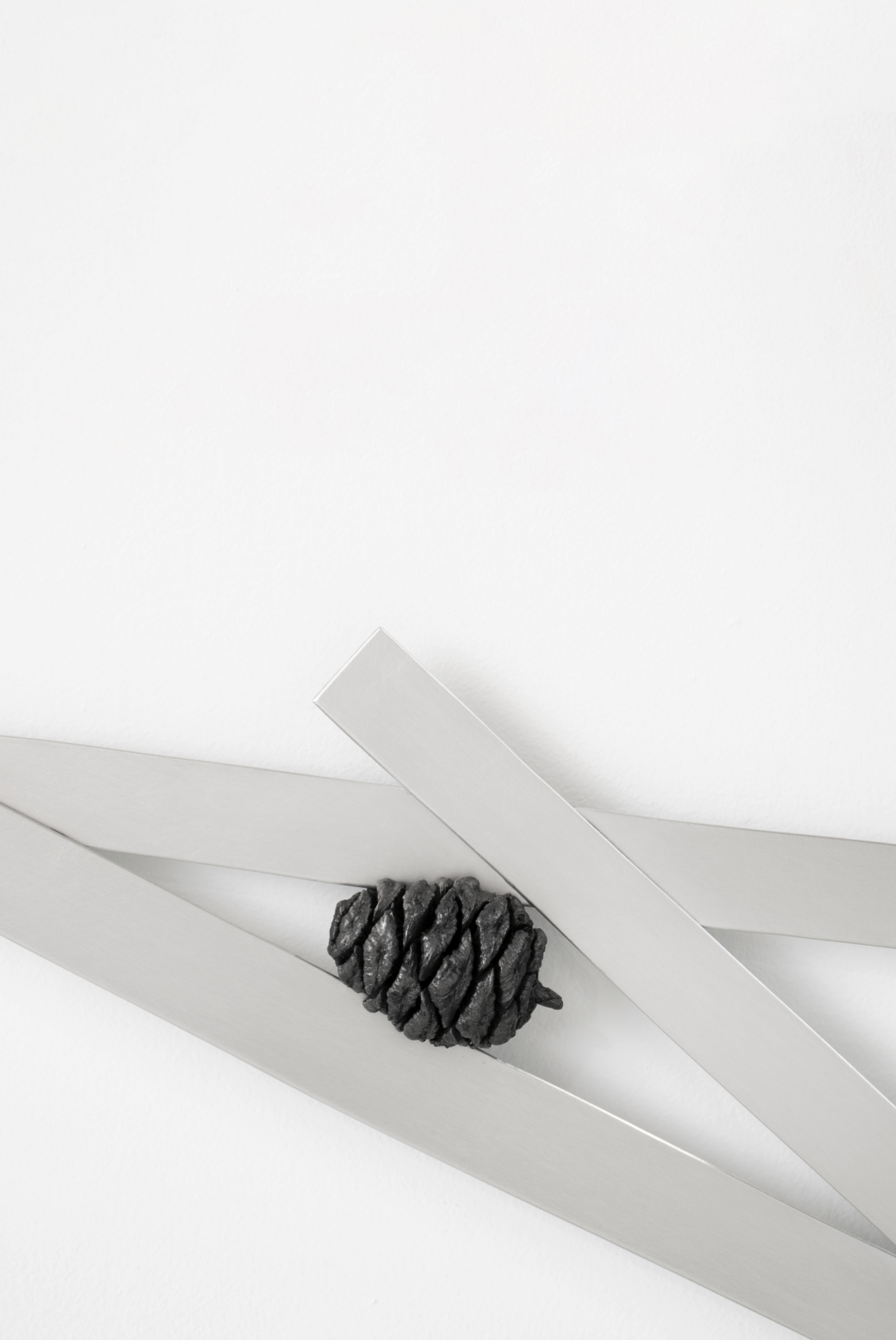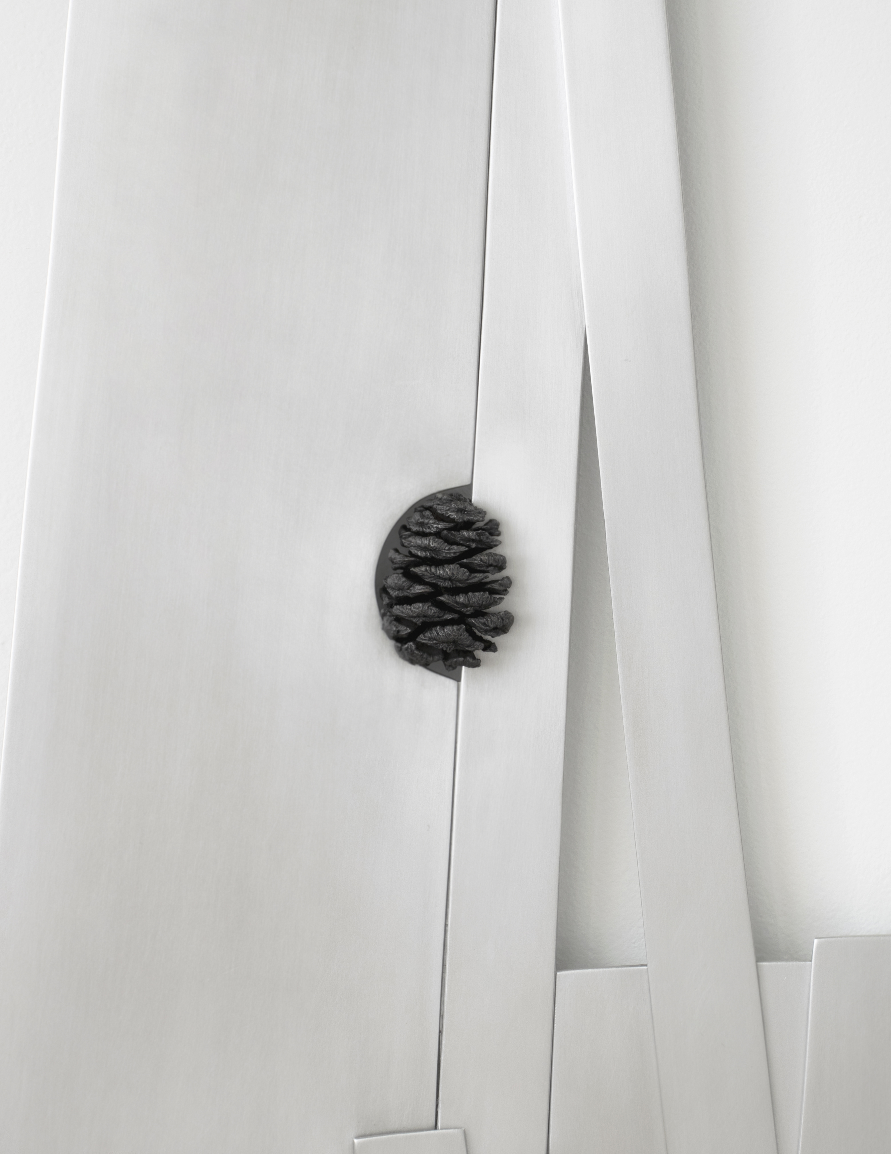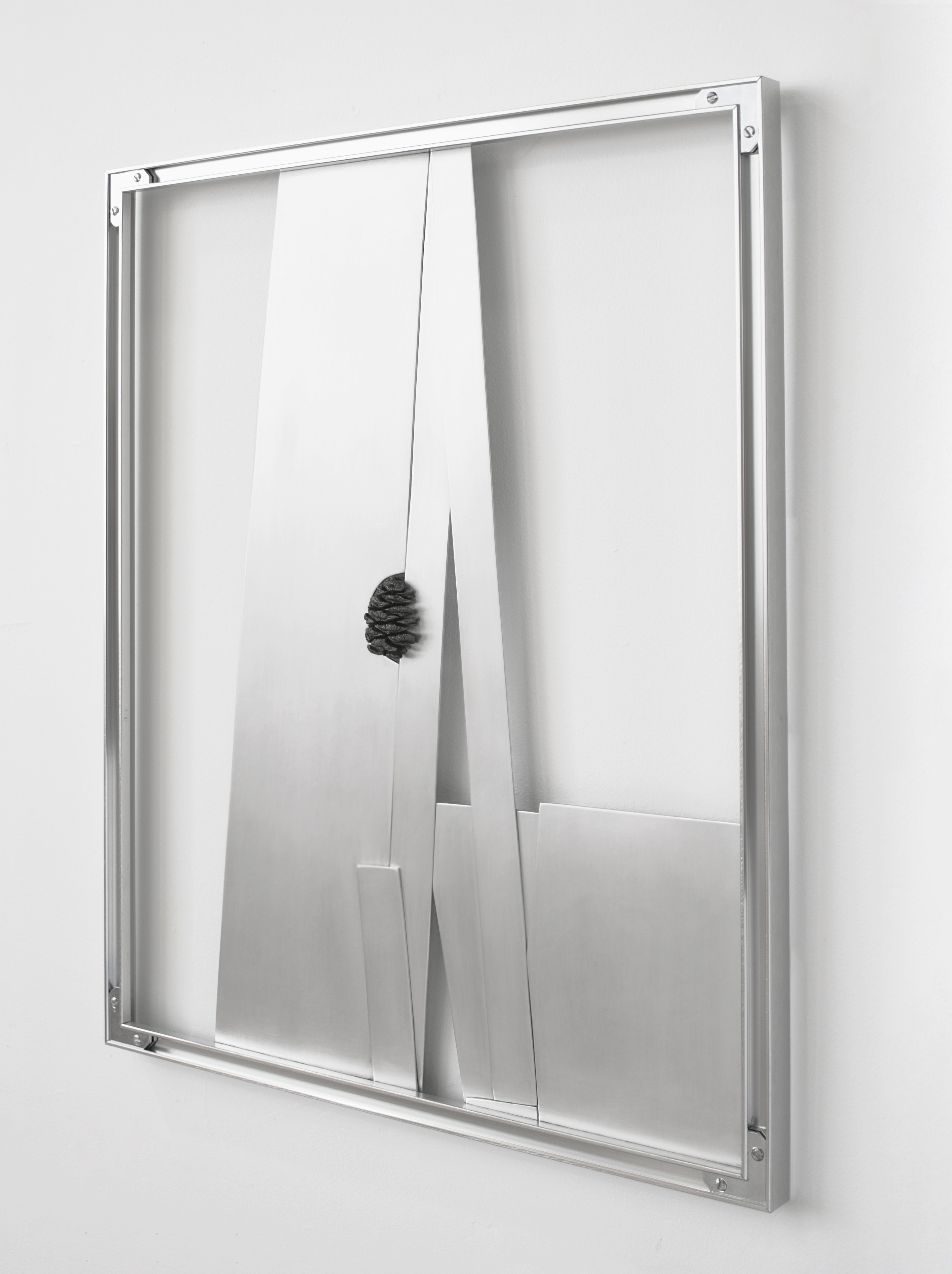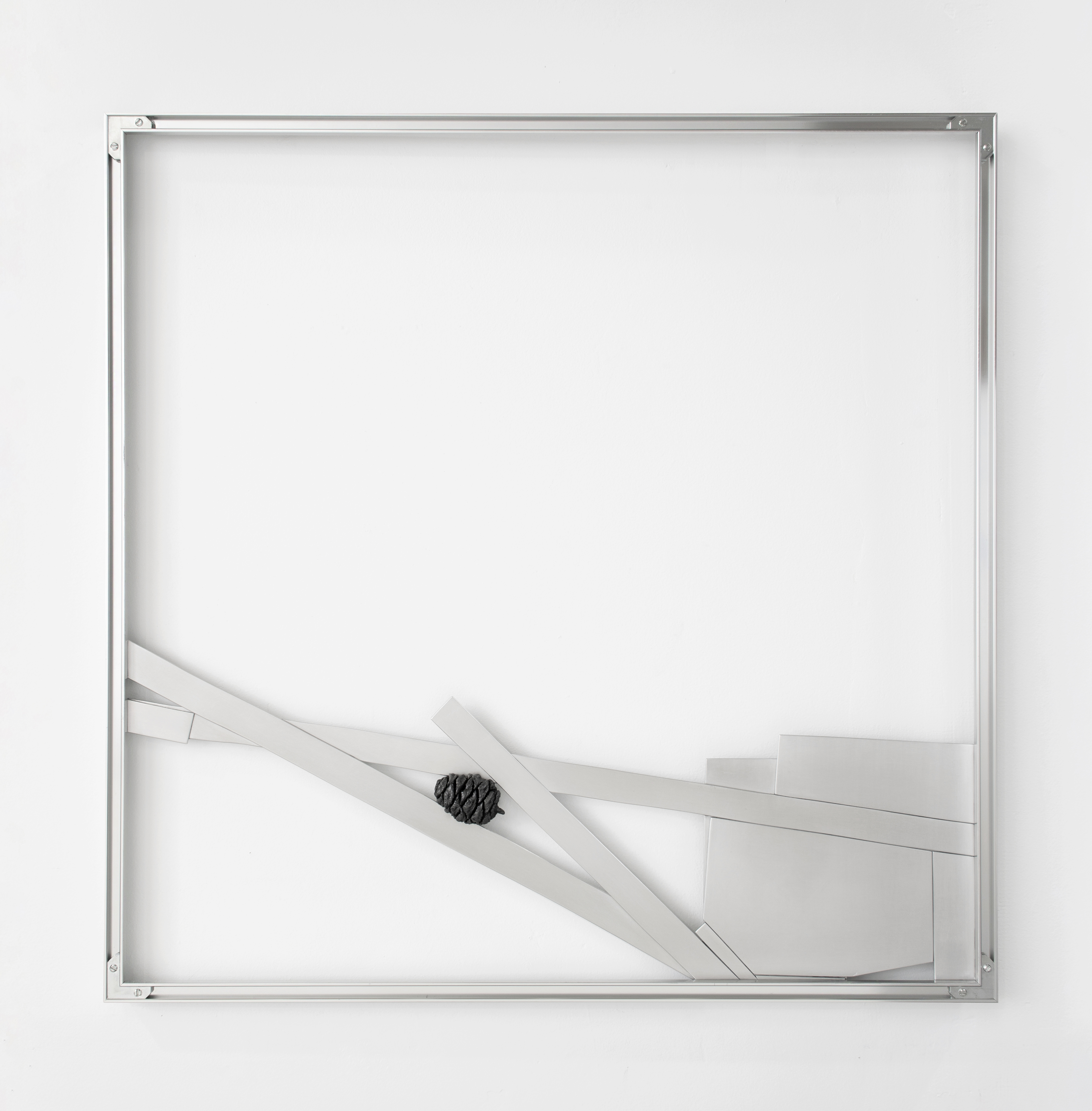 repurposed brushed aluminum, graphite rubbed Giant Sequoia pinecone, aluminum frame,