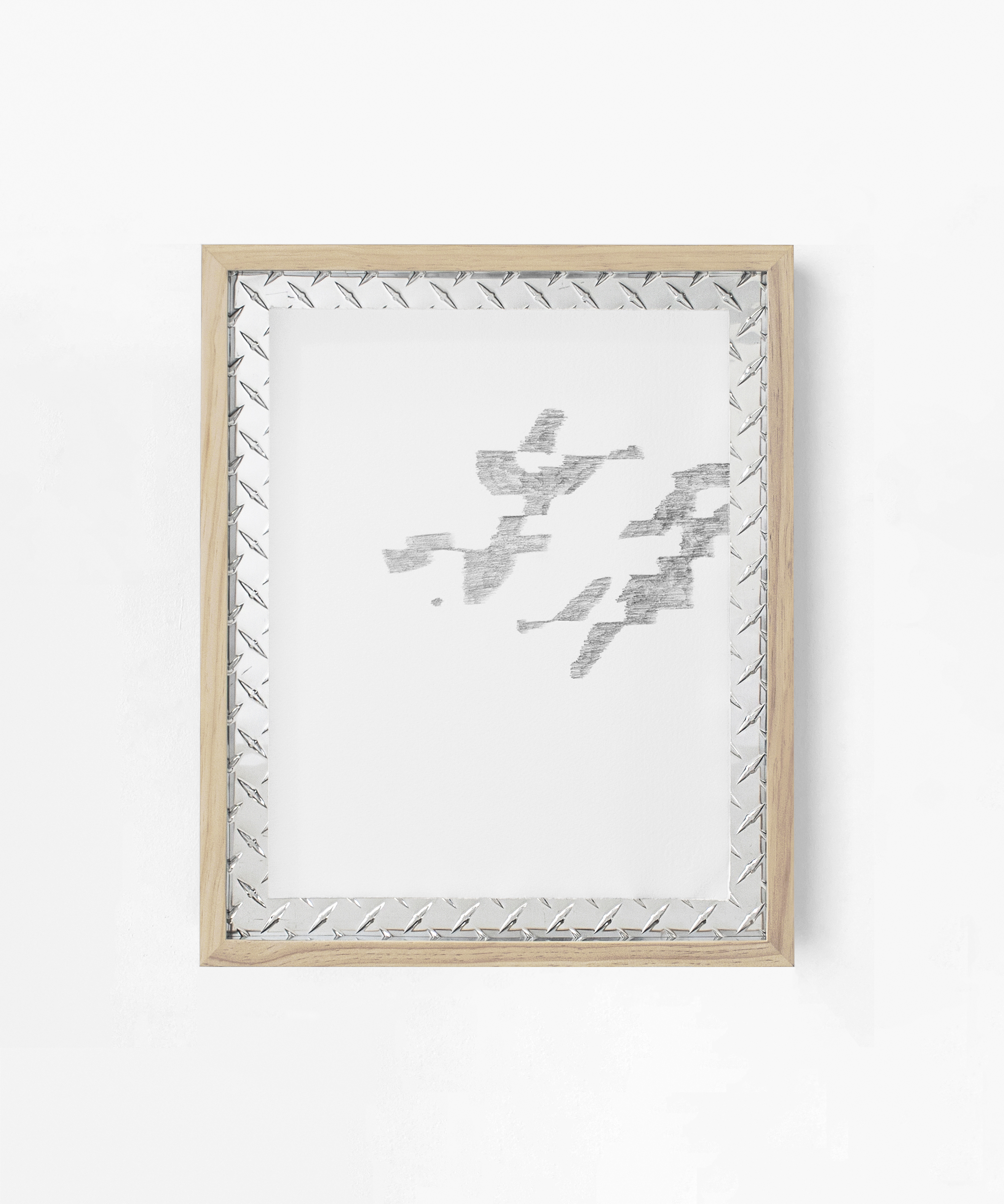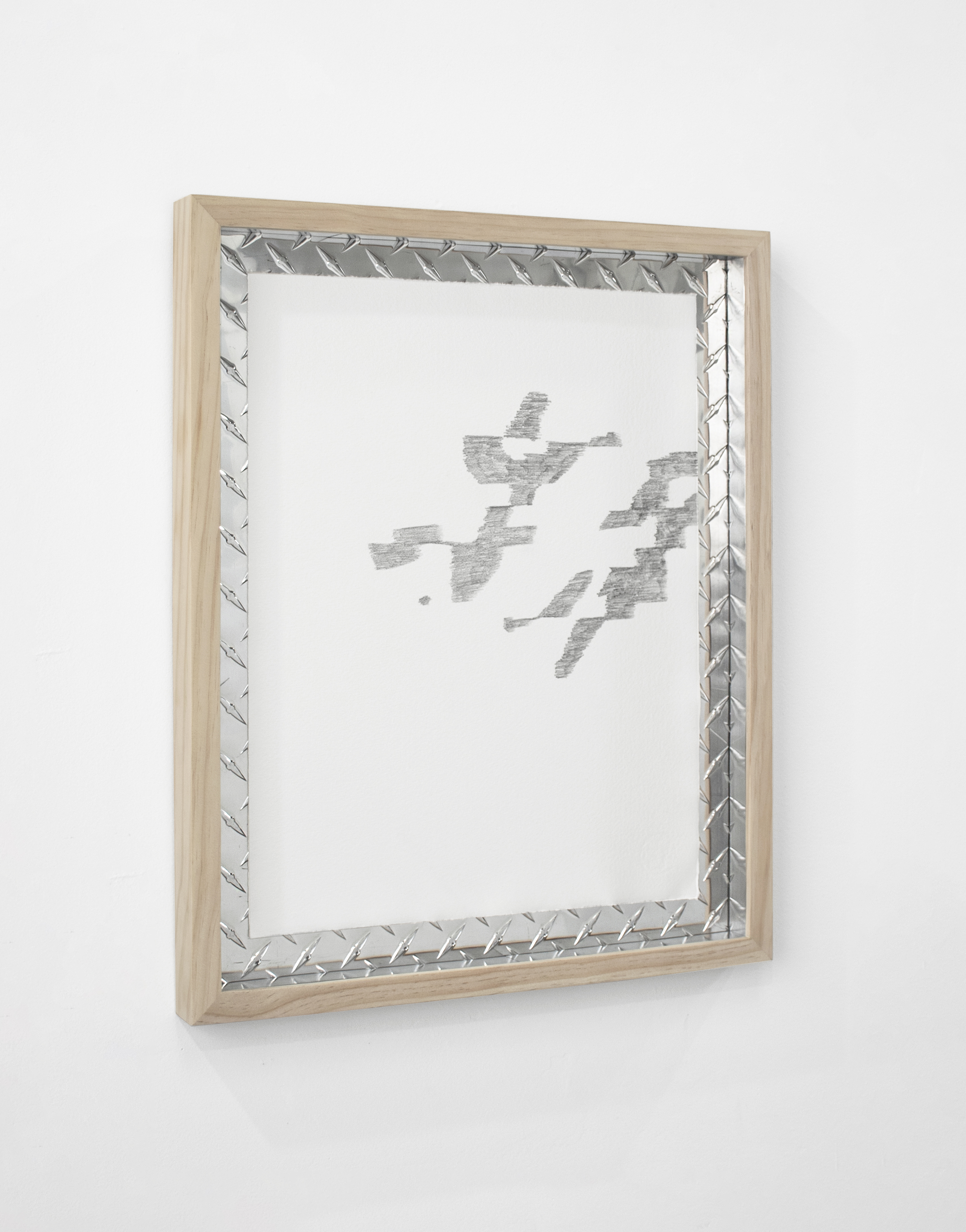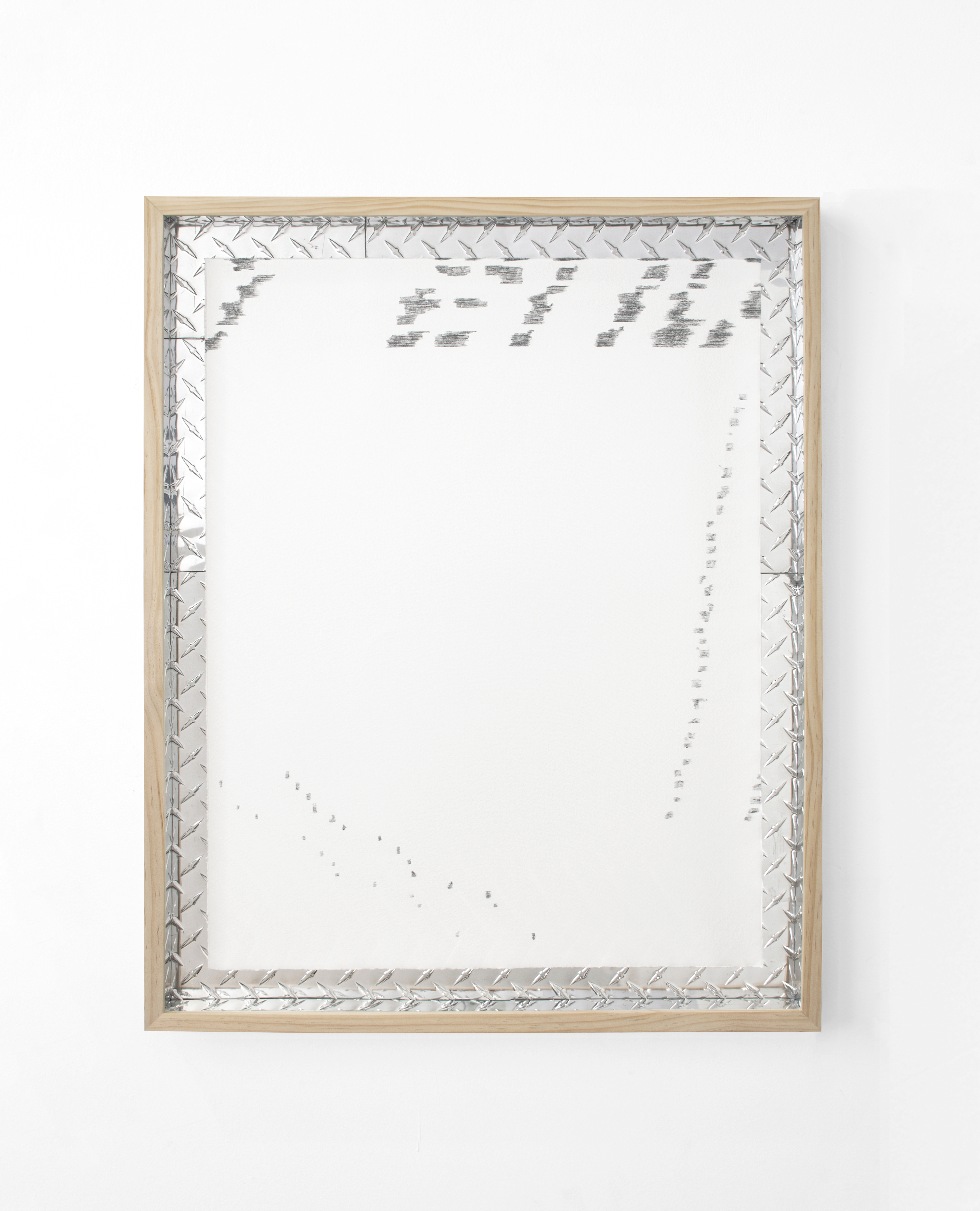repurposed aluminum, graphite on Hahnemühle paper, wooden frame, and hardware