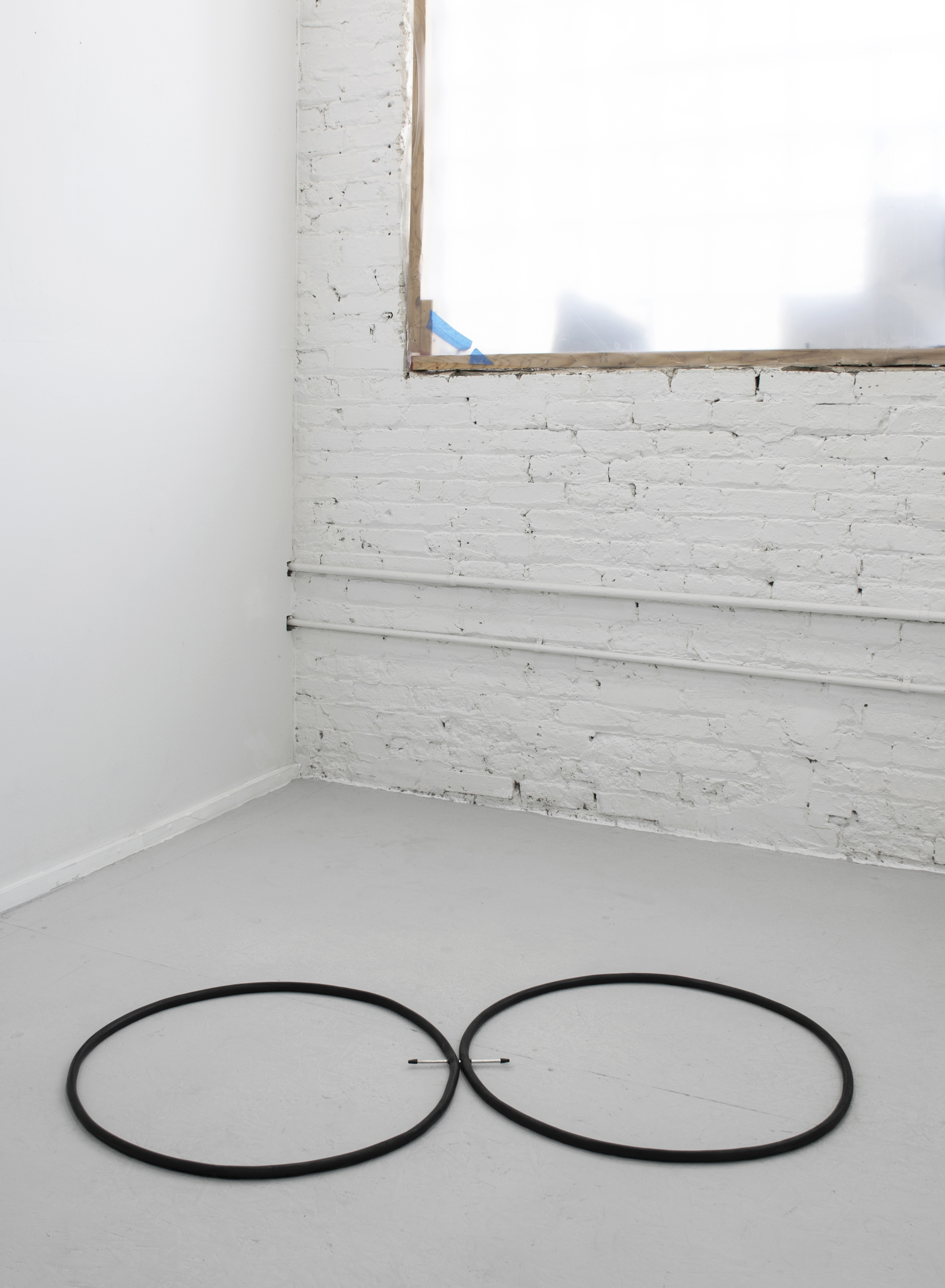(rolled trash can, circle drawing) 2015. polished city trash can, graphite and rust