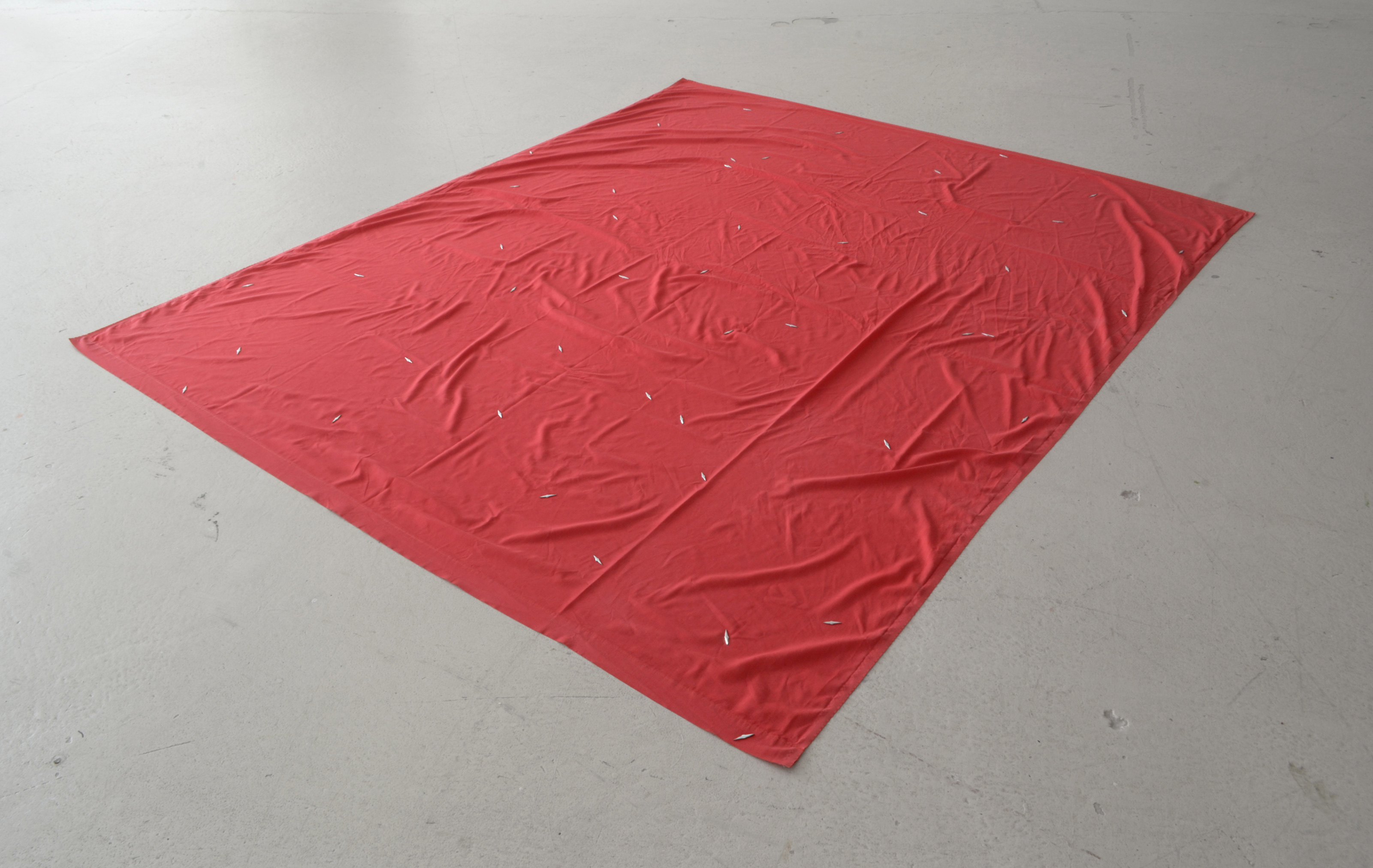 cotton bedsheet that belonged to the artist, repurposed diamond-plated aluminum, and hardware